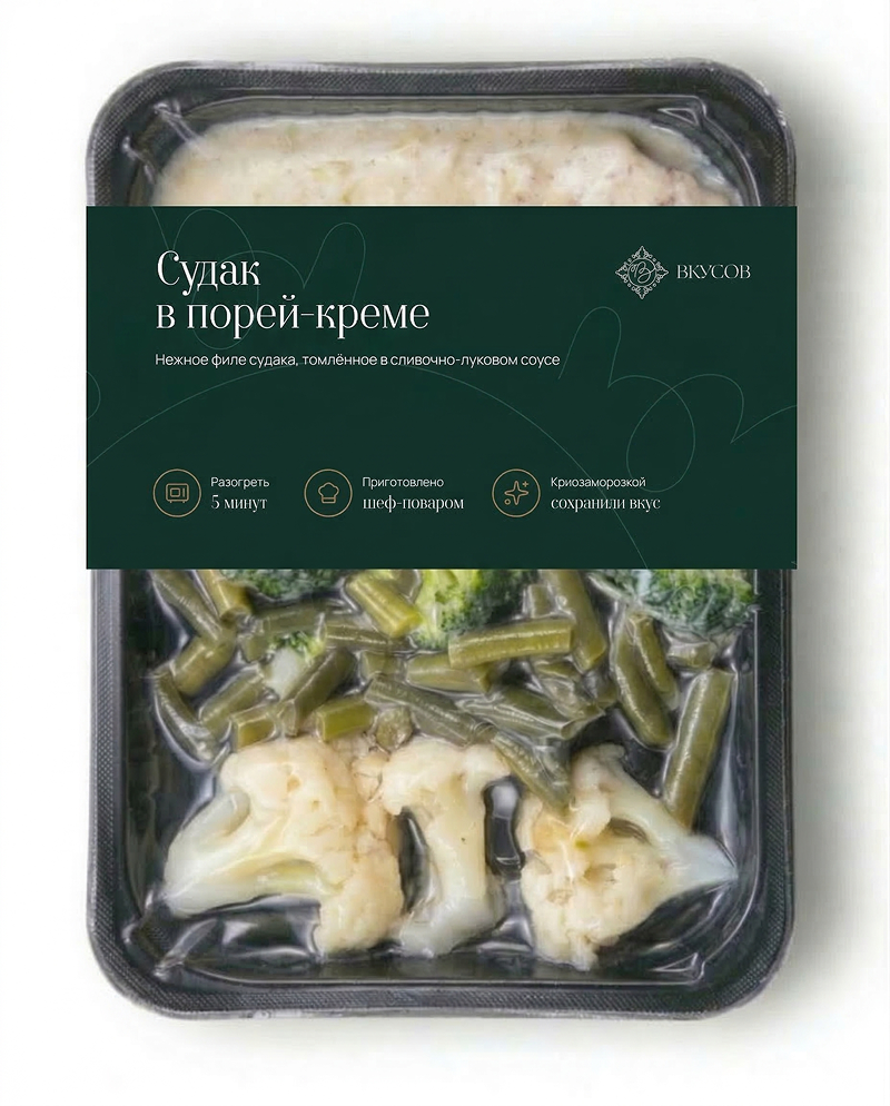 Нежная рыба с кремом из лука-порея и зеленью. Деликатная текстура и аккуратный вкус для ресторанной линейки.
